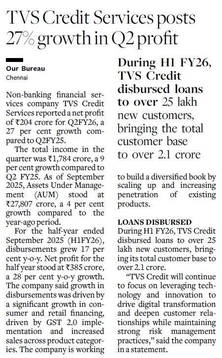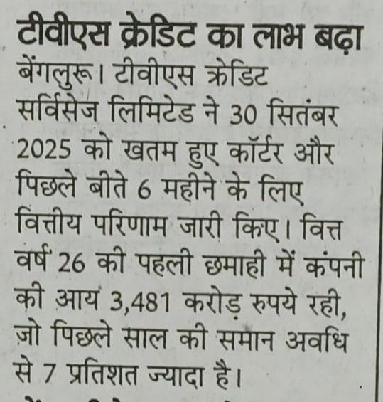 टीवीएस क्रेडिट सर्विसेज़ ने क्यू2 लाभ में 27% की वृद्धि दर्ज की